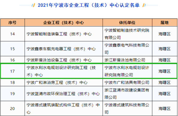 發(fā)布日期:2022.09.15 近日,寧波市發(fā)展和改革委員會、寧波市經(jīng)濟和信息化局、寧波市財政局、寧波市科學(xué)技術(shù)局聯(lián)合發(fā)文,公布2021年寧波市企業(yè)工程(技術(shù))中心認(rèn)定名單。我院為主體申報的“寧波水利水電... -