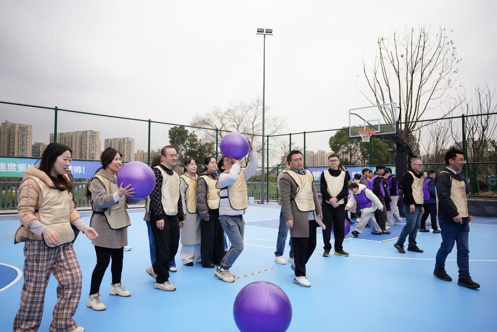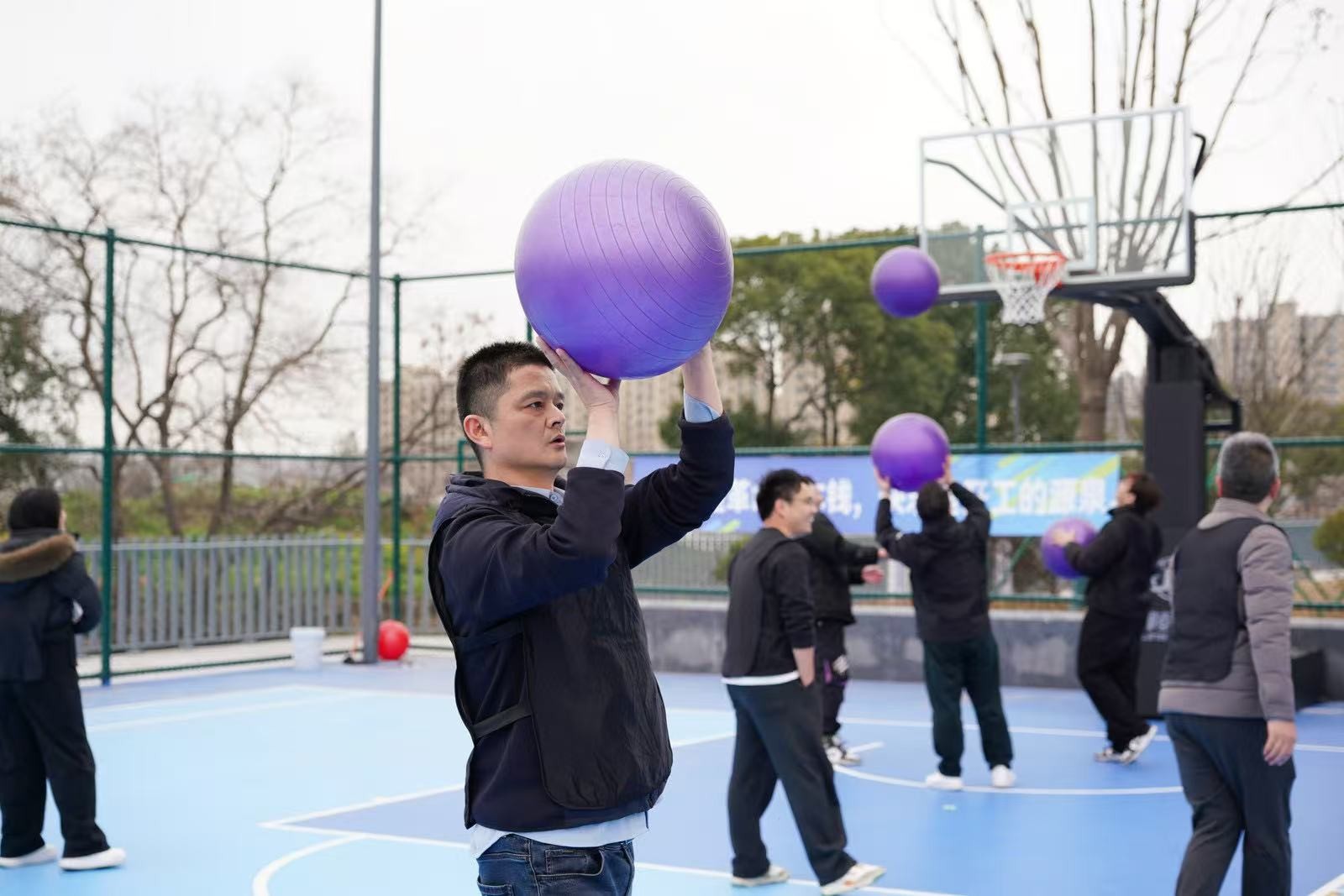 “勇立潮頭”考驗的是反應(yīng)與穩(wěn)定,隊員們圍成圓圈快速移動,同步接住充氣柱,1分鐘內(nèi)有效移動次數(shù)不斷刷新。“超級NBA”中,大家用瑜伽球投籃,雖姿勢各異,但進(jìn)球瞬間的歡呼同樣熱烈。“乘風(fēng)破浪”要求隊員在充氣墊上接力鋪設(shè)充氣棒,讓體重不輕于75kg的“重量級”選手穩(wěn)坐墊上,隊友們默契配合,如乘風(fēng)破浪般前行。最后的“巨人腳步”由每隊兩名領(lǐng)隊腳穿巨型鞋蹼接力奔跑,滑稽的動作引來全場笑聲不斷。