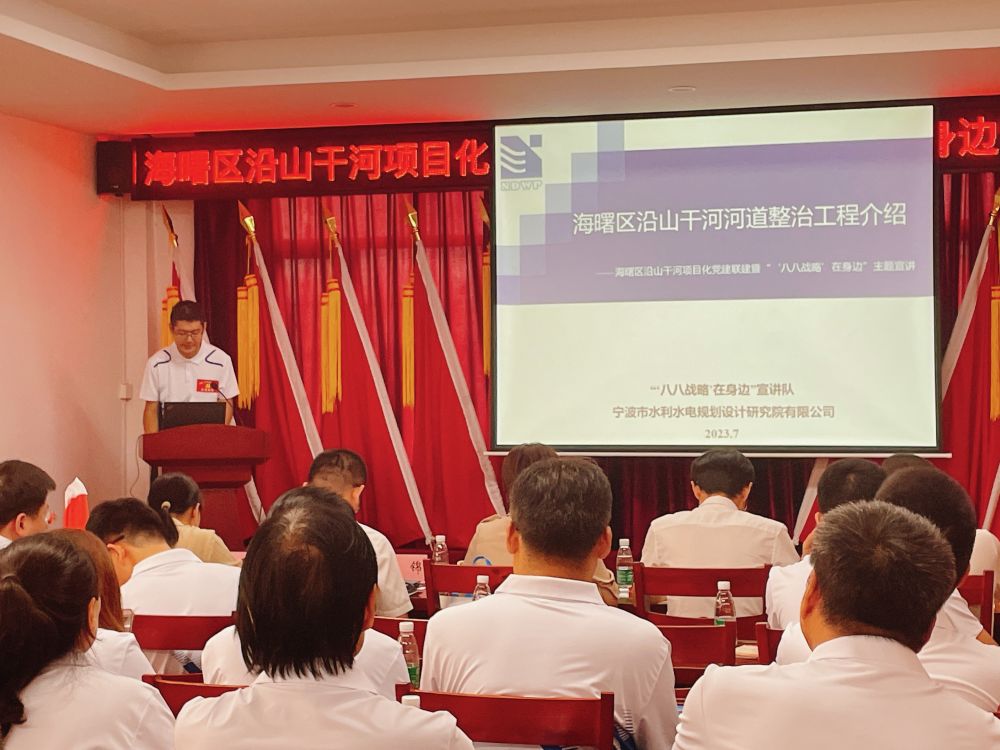 儀式結束后,新聘任的“‘八八戰(zhàn)略’在身邊”宣講隊成員之一,我院沿山干河項目組成員褚洪康,做了《海曙區(qū)沿山干河河道整治工程介紹》的匯報,標志著項目主題宣講正式啟動。